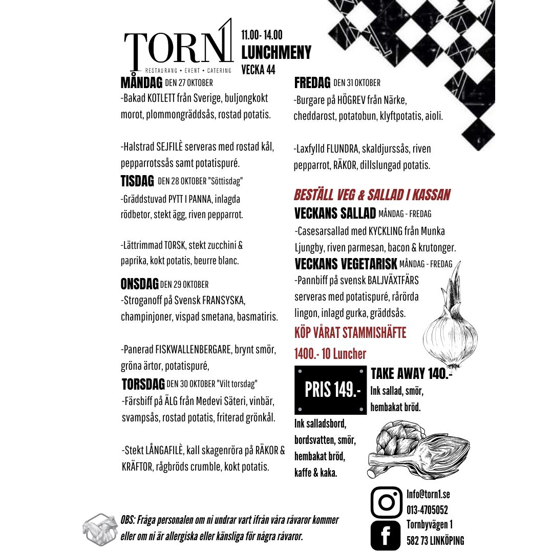 Läs merMiddagar, catering, konferenser, events och matlagningskurser bokas enklast via info@torn1.se eller telefon 013–470 50 52. Mer information finns på respektive sida.