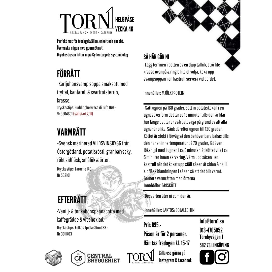 Torn1 erbjuder en färdigpackad, nästan färdiglagad påse. Här får du en middagsmeny lika god som den vi serverar i restaurangen och i vår catering. Helgpåsen är fylld med förrätt, huvudrätt och dessert. Vägledning för färdigställande av rätterna medföljer i påsen samt även dryckesrekommendationer så att du enkelt kan skapa den ultimata middagen.